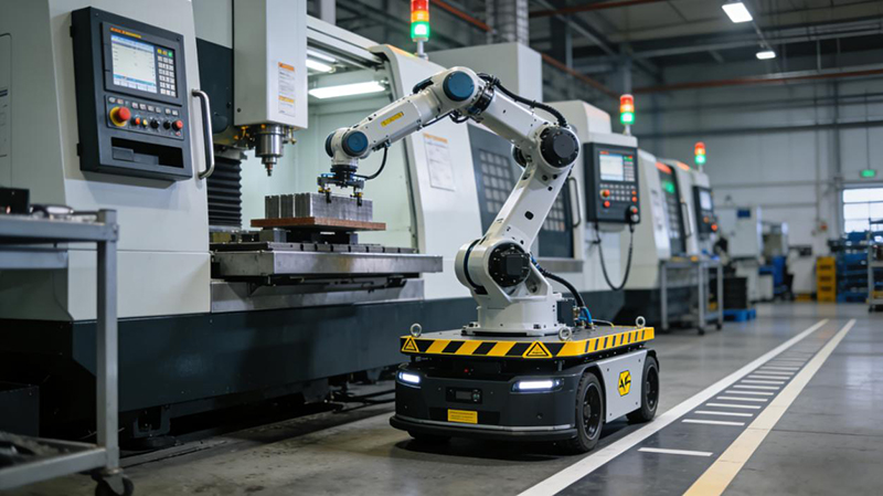 CNC数控机床上下料是复合机器人的典型应用场景。在汽车零部件制造中,AGV搭载机械臂可自主穿梭于多台CNC设备间,完成工件精准抓取、上料、下料全流程。某3C电子厂引入AGV复合机器人后,插件合格率从95%提升至99.2%,每月返工成本从6万元降至1.2万元,年节省人力成本18万元,投资回收期仅18个月。