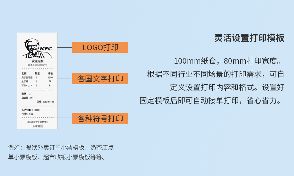 支持二维码、LOGO打印,可设置打印内容和格式,设置好固定模板后便自动接单打印,省心省力。