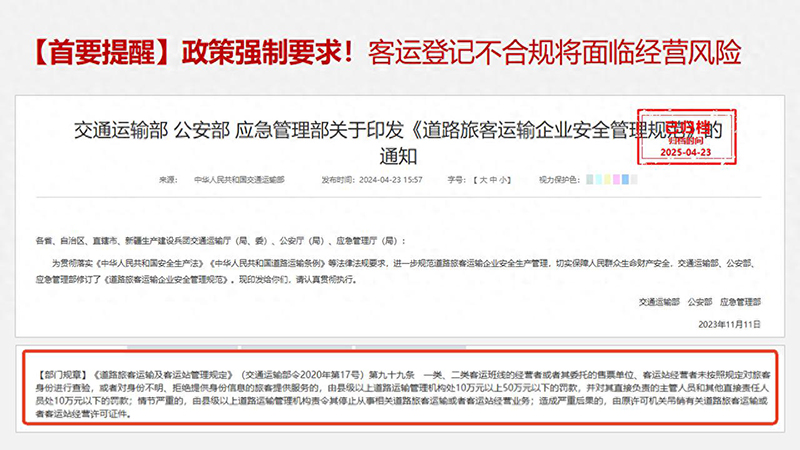近日,交通运输部、公安部、应急管理部联合修订印发的《道路旅客运输企业安全管理规范》再次强调,客运经营者必须按规定对旅客身份进行查验。根据《道路旅客运输及客运站管理规定》,违规者将面临10万至50万元罚款,情节严重的甚至会被吊销经营许可证。