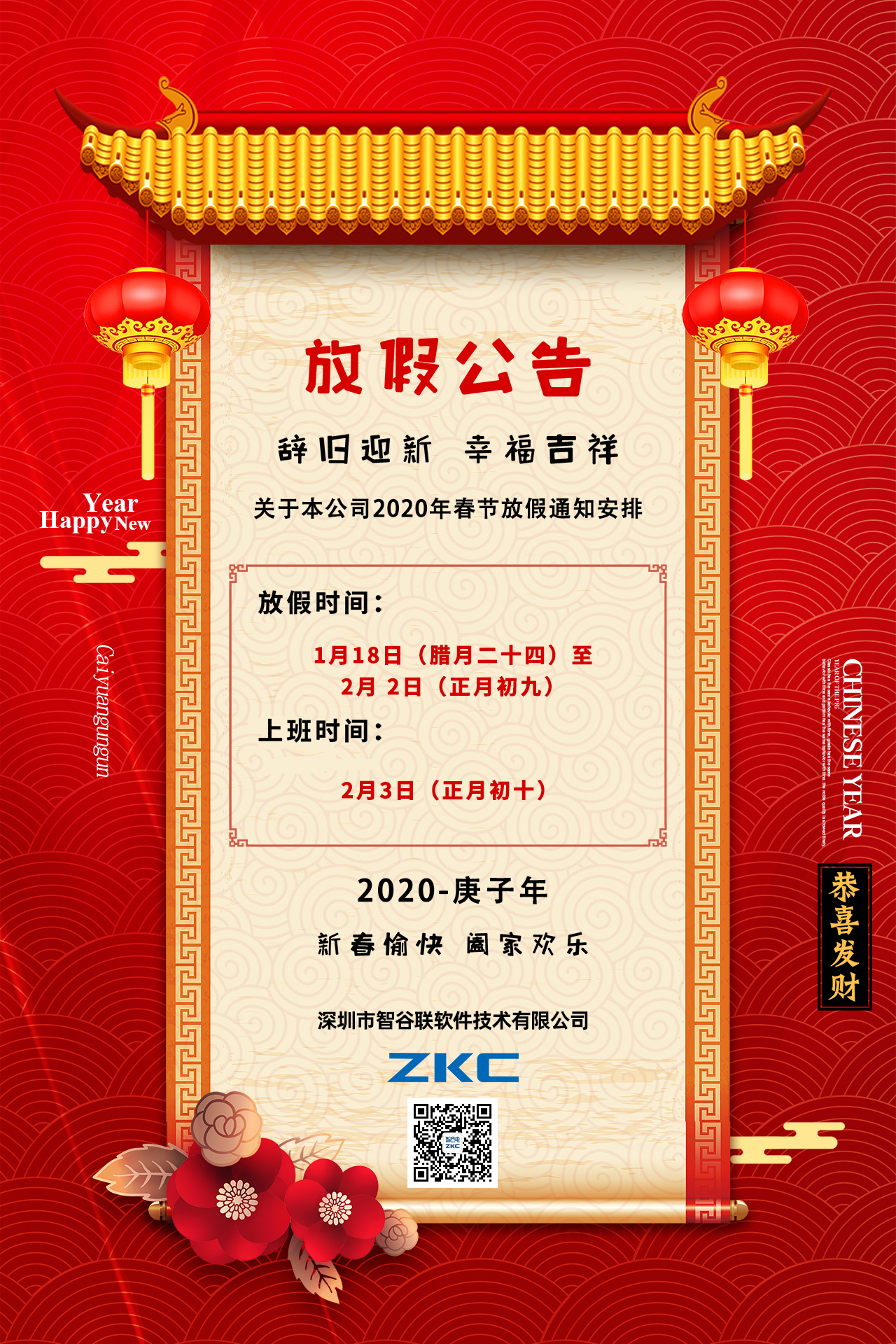 【2020年春节放假公告】预祝您新春愉快,鼠年大吉!