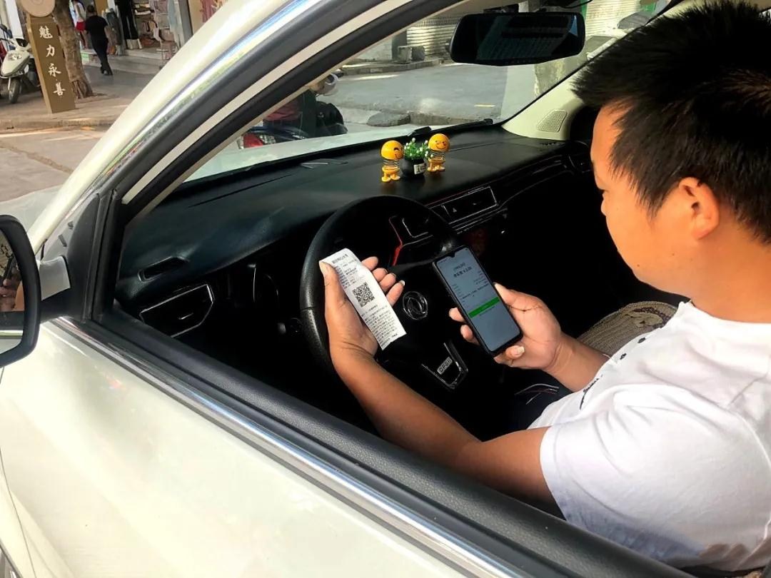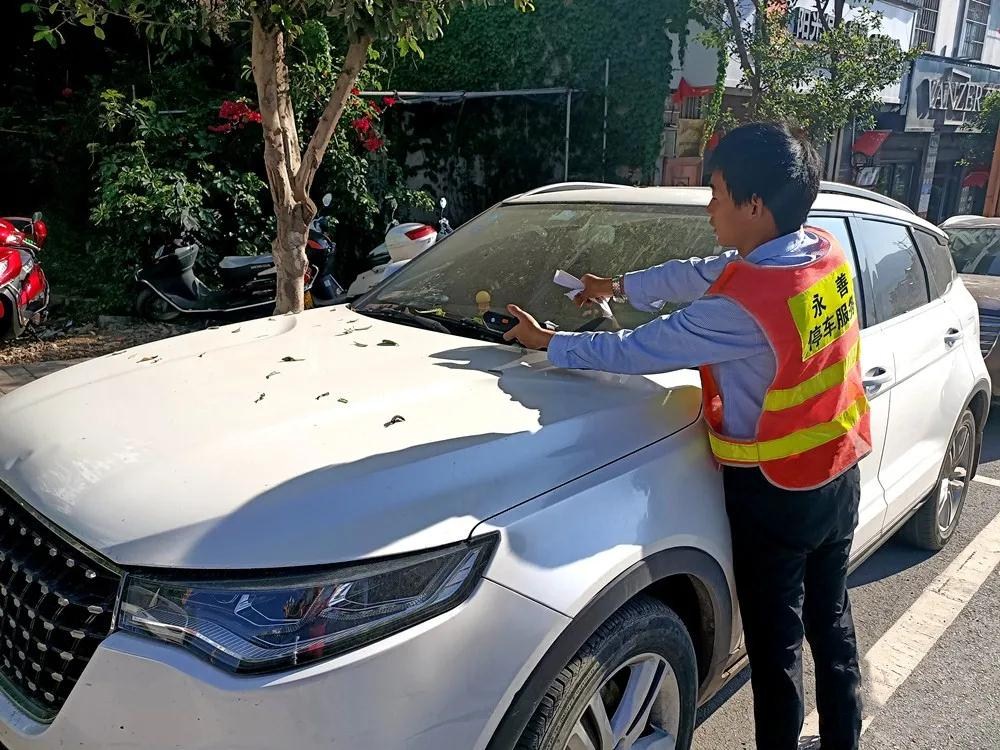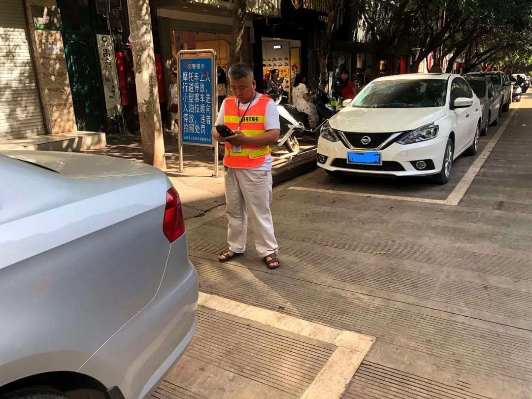 如图所示,在永善县街道车辆规范停在划定的临时停泊位内,收费员正拿着 PDA 手持终端机,对前来临时停泊的车辆车牌进行扫描,将车辆信息传递给后台管理终端,并打印出道路临时停车入场小票放到车辆挡风玻璃左下角显眼位置,小票上面有车牌号、停泊路段、进场时间、二维码、联系方式等内容。