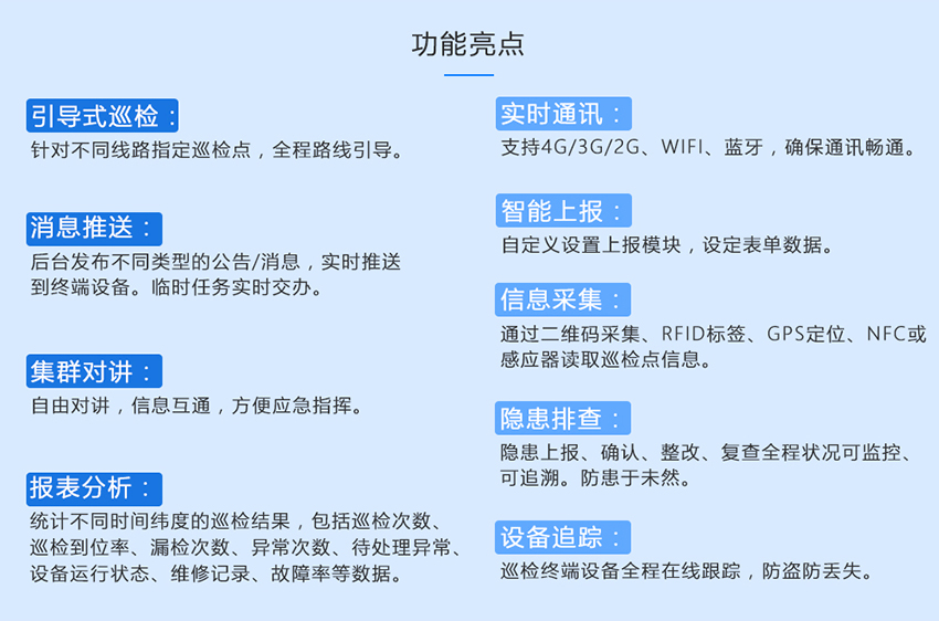 智谷联智能巡检系统基于SaaS模式,集GPS定位、对讲、图片传输、数据上报等技术于一体,拥有线路巡更、智能上报、实时通讯调度、集群对讲四大主要功能。一改传统人工监管模式,助力巡检工作的高效执行和迅速反馈。