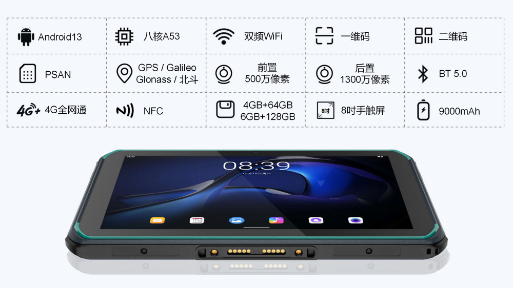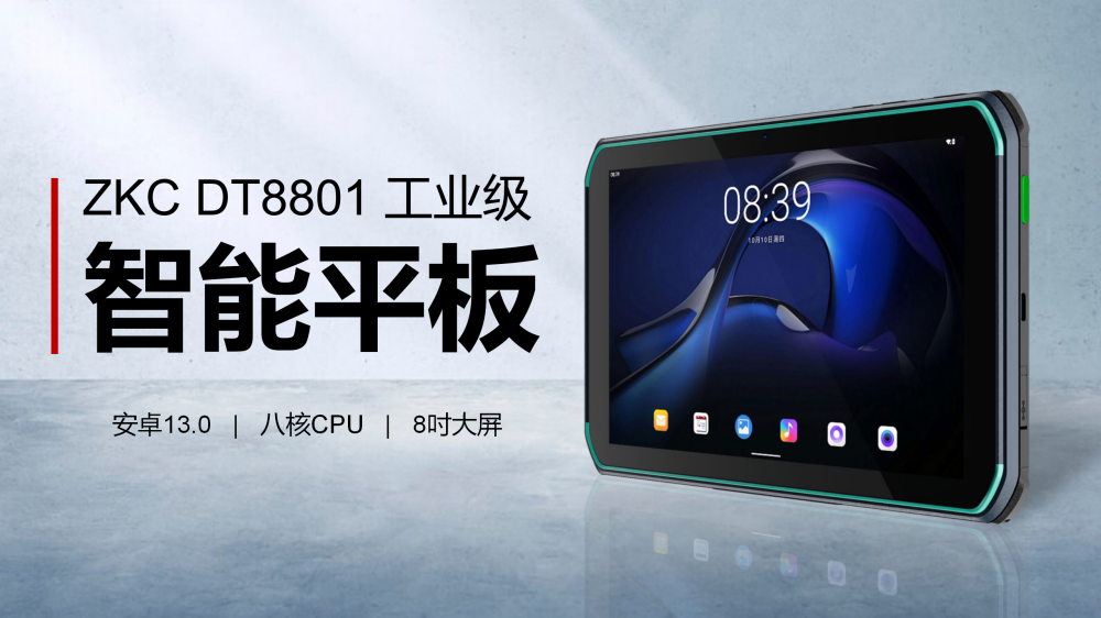 产品描述:ZKC DT8801 8寸工业级智能平板,基于Andriod 13操作系统, 采用八核处理器,集成条码扫描、1300W摄像头拍照录像、NFC读写等功能,广泛应用于智慧工业、仓储物流、建筑工程、能源电力、无人机、汽车服务、航空、车载、勘探、医疗、金融、教育、智能机器设备等领域。